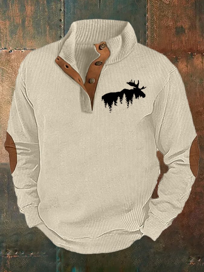 Corduroy Western Style Elk Print Stand Collar Button Down Men's Sweatshirt