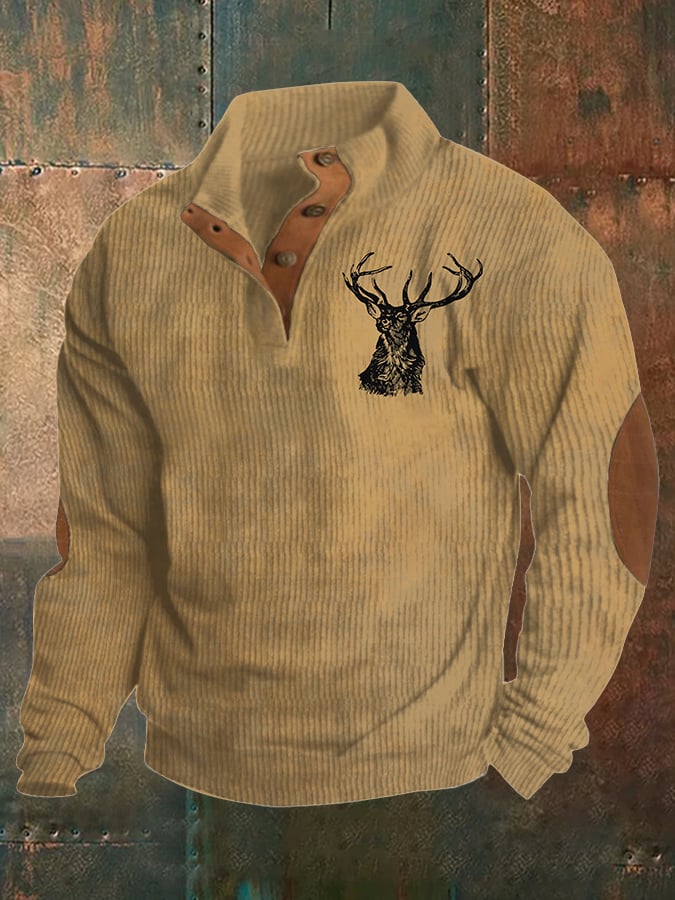 Corduroy Western Style Elk Print Stand Collar Button Down Men's Sweatshirt