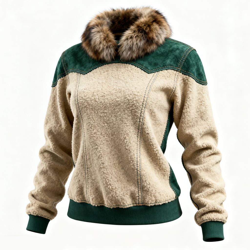 • Design Elements: Faux Fur Collar. Contrasting Color Block Design. Ribbed Cuffs
