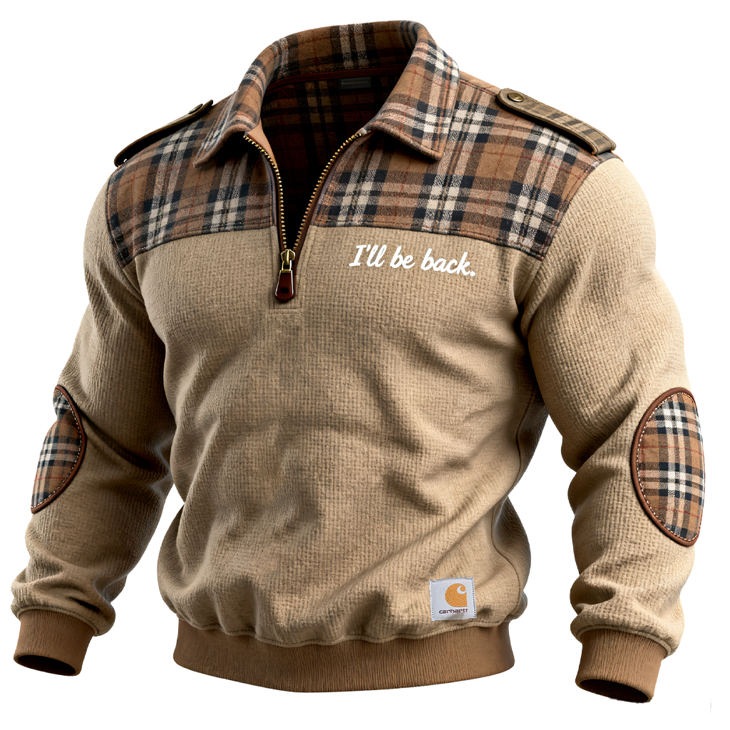 • Design Elements: Plaid accents on shoulders and elbows. half-zip closure. embroidered text detail
