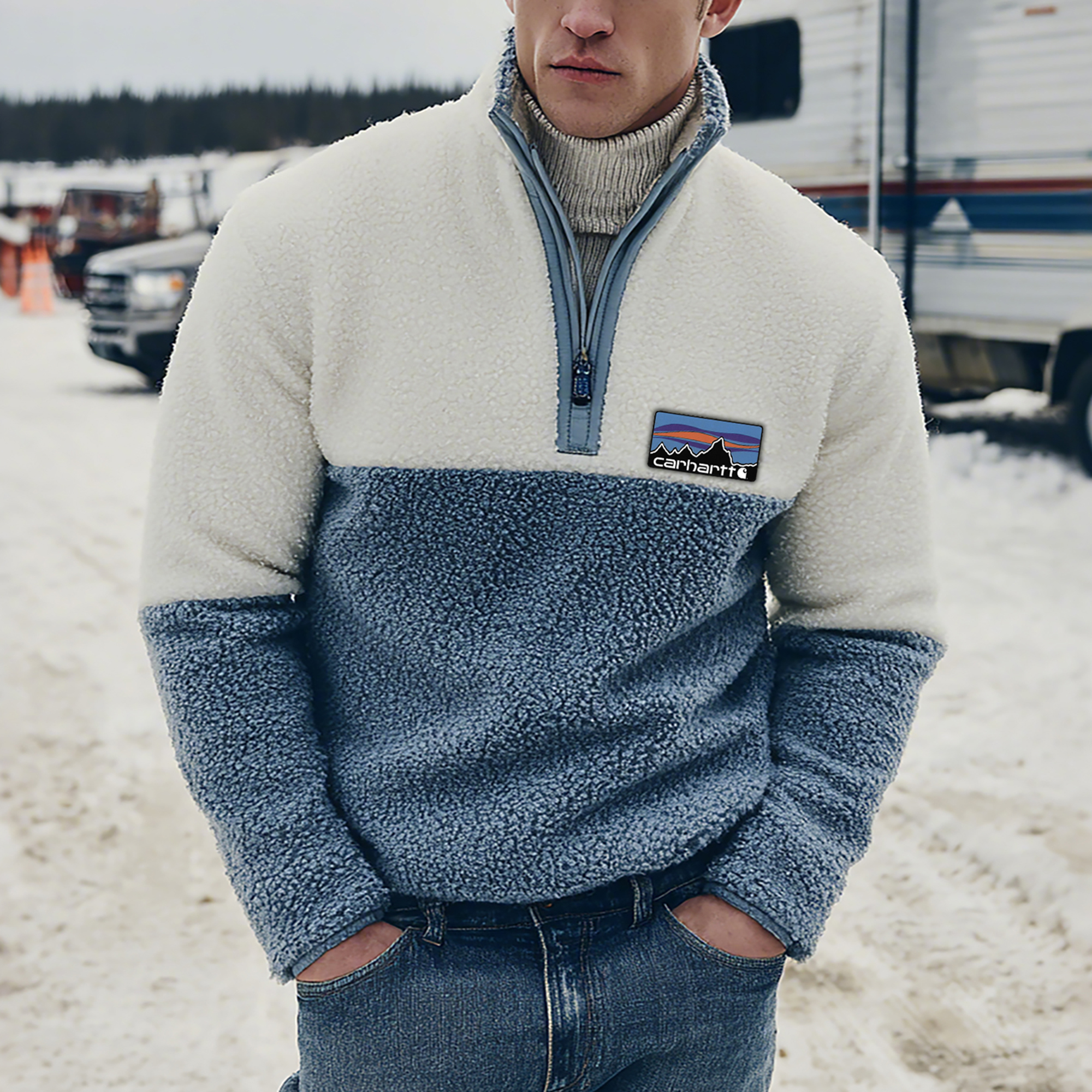 • Design Elements: Color-blocked design with a mountain-inspired patch. half-zip closure. ribbed collar