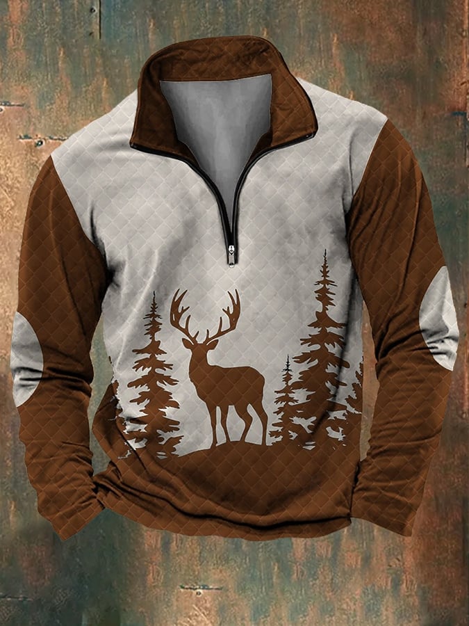 Men's Retro Elk Colorblock Zip-Up Sweatshirt
