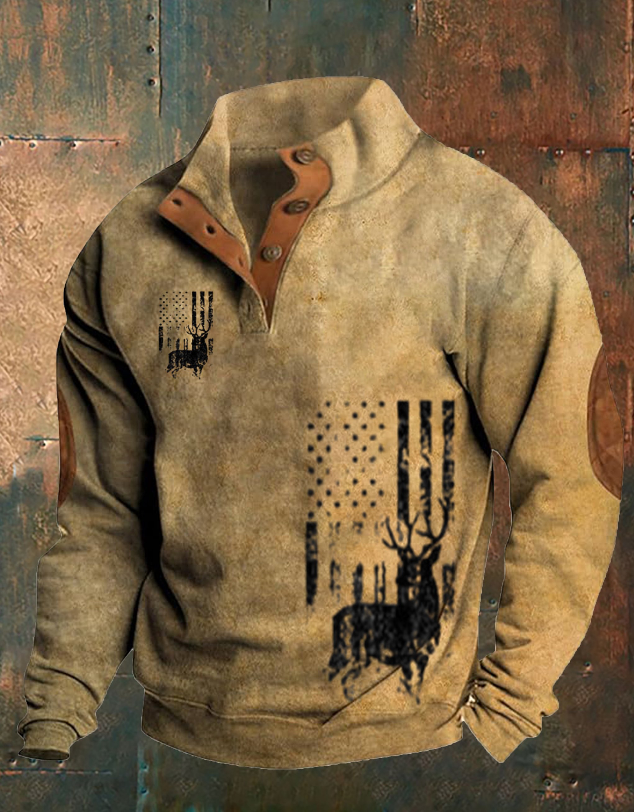 Men's Retro Flag Western Print Stand Collar Button Sweatshirt