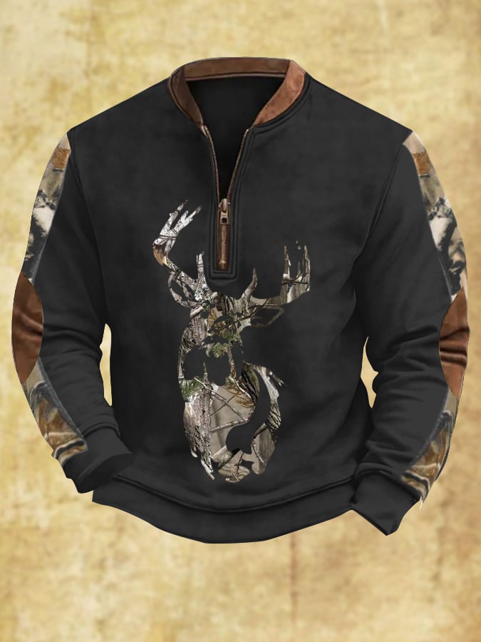 Men's Retro Western 3D Deer Print Zip Collar Sweatshirt