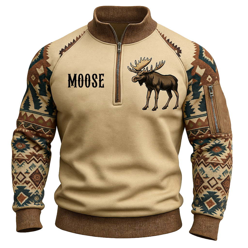 • Design Elements: Embroidered moose graphic. tribal pattern sleeves. half-zip closure