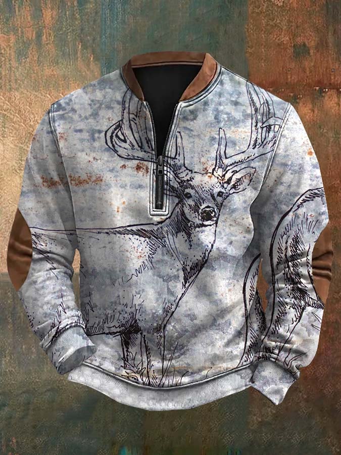 Men's Vintage Western Elk Print Zip-Up Sweatshirt