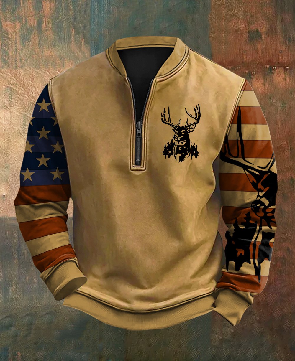 Men's Vintage Western Elk Print Zip-Up Sweatshirt