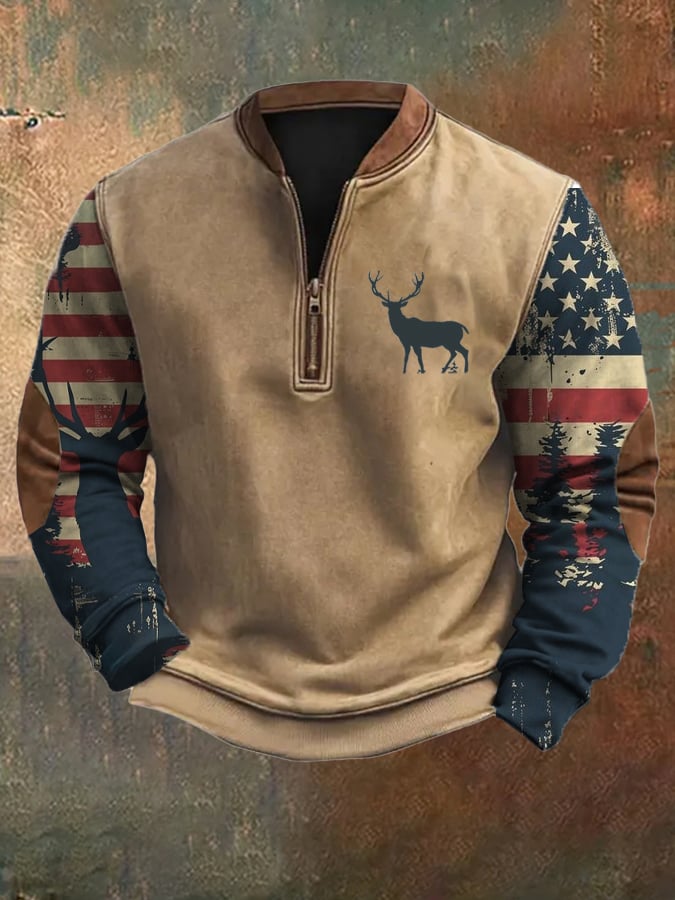 Men's Vintage Western Flag Elk Print Zip-Neck Sweatshirt