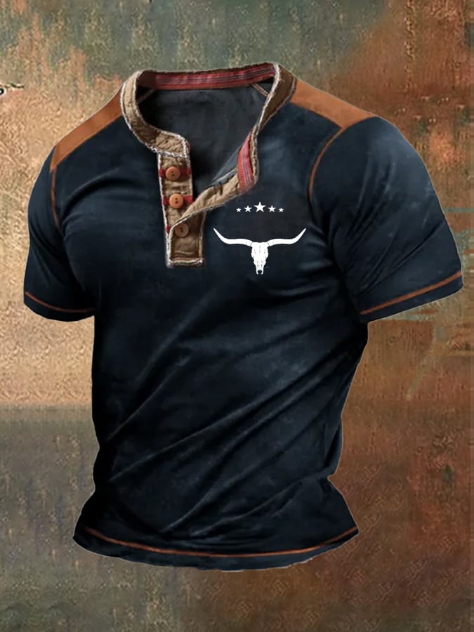 Men's Vintage Western Print Henley Neck T-Shirt