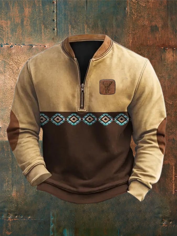 Men's Western Style Printed Baseball Collar Zip Sweatshirt