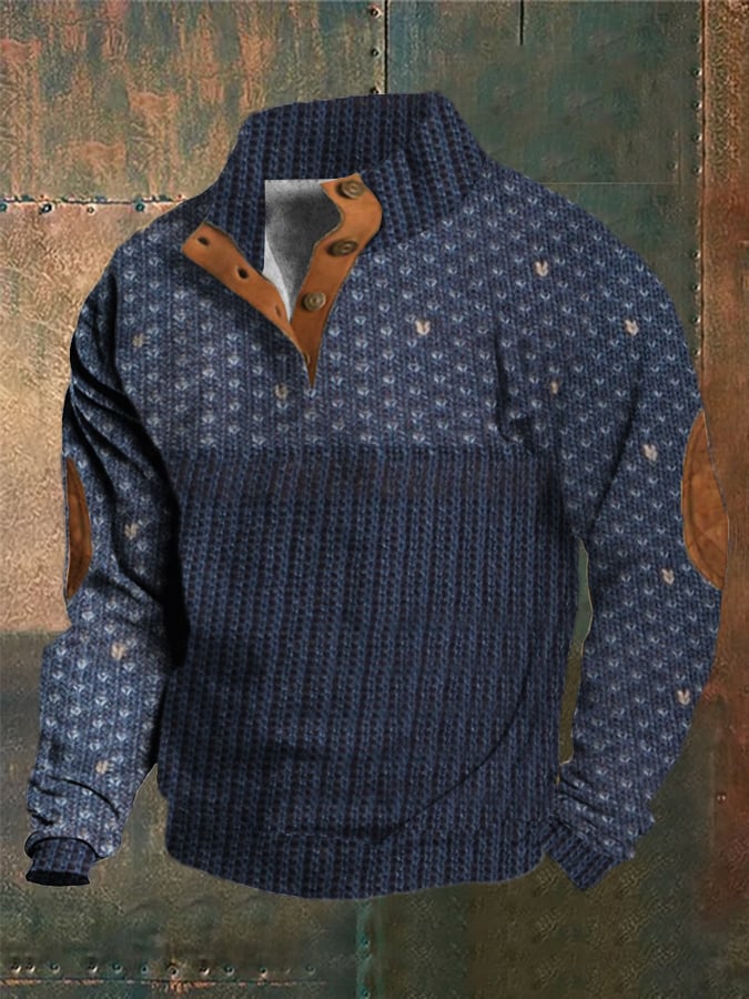 Men's Western Vintage Knitted Jacquard Print Stand Collar Button Sweatshirt