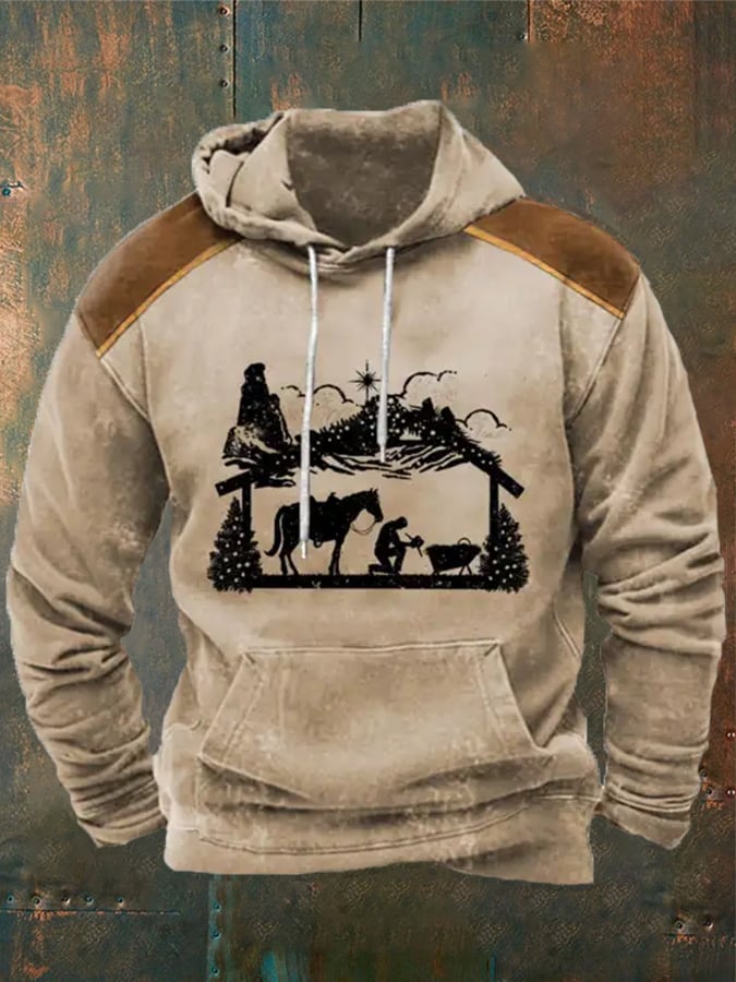 Men's Western Vintage Prayer Print Hooded Drawstring Pocket Sweatshirt