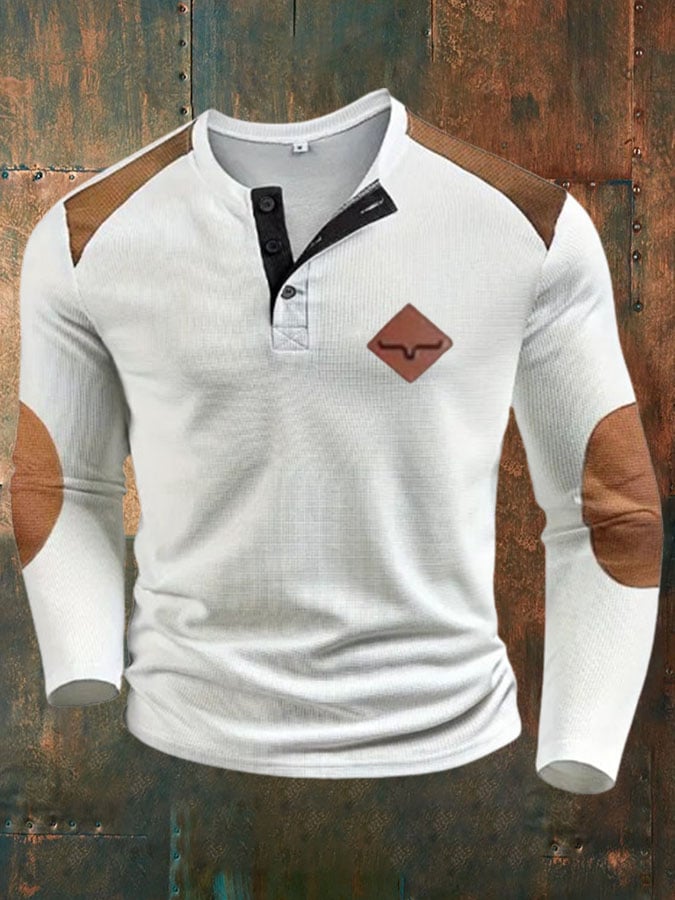 Men's Western Vintage Waffle Print Long Sleeve Button T-Shirt