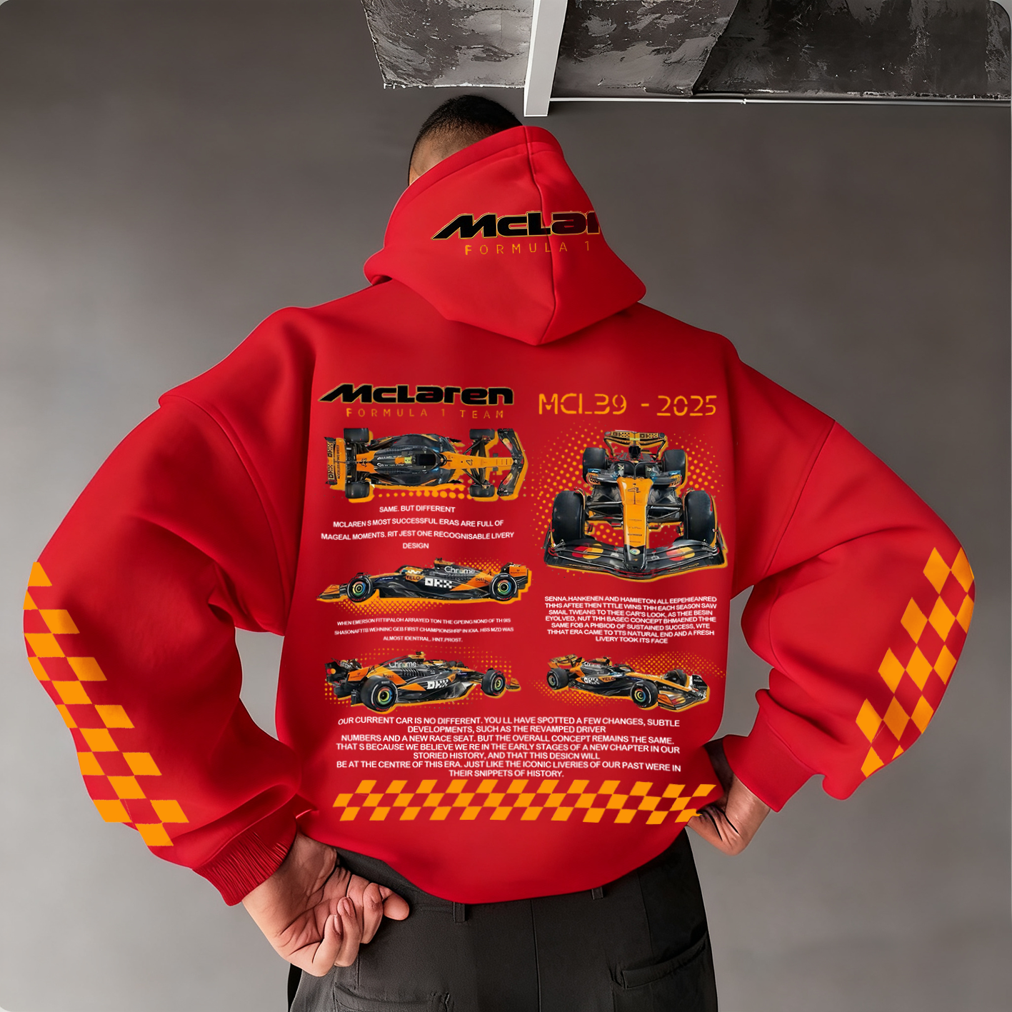 • Design Elements: Detailed Car Illustrations. Checkered Flag Pattern. Team Logos