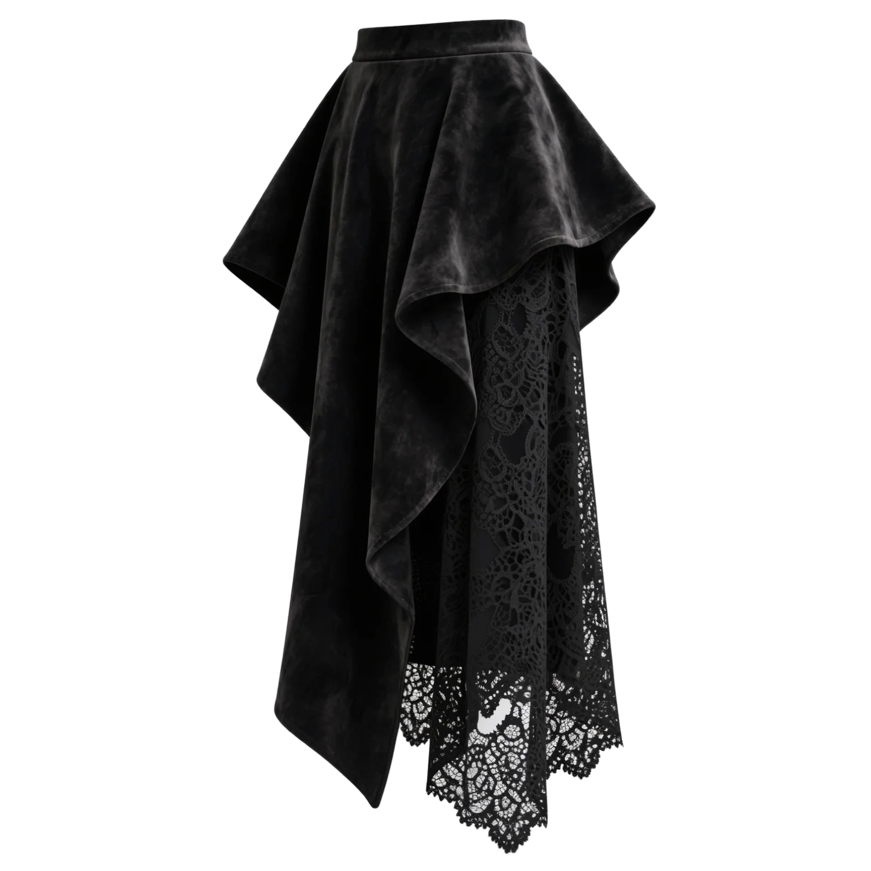 • Design Elements: Asymmetric layered design. lace detailing. elegant silhouette
